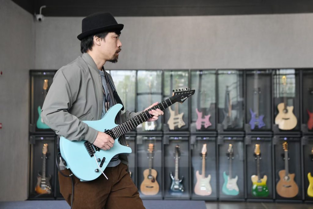 Mars Chen, vice president of Hotone, performing to show visitors from the media the tonal variations electric guitars can achieve (Photo: Fortune Times)