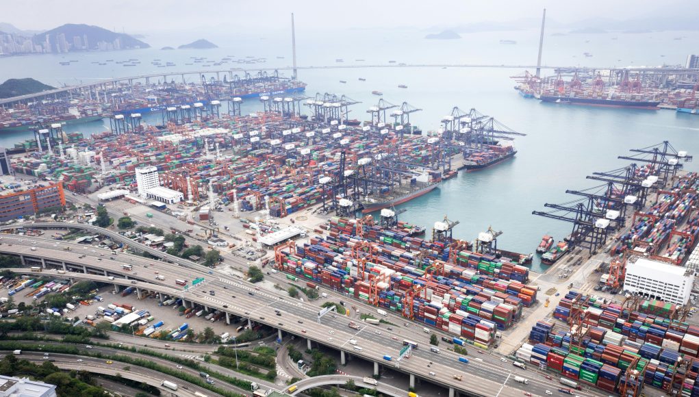 Aerial view of Hong Kong’s container terminals and Stonecutters Bridge