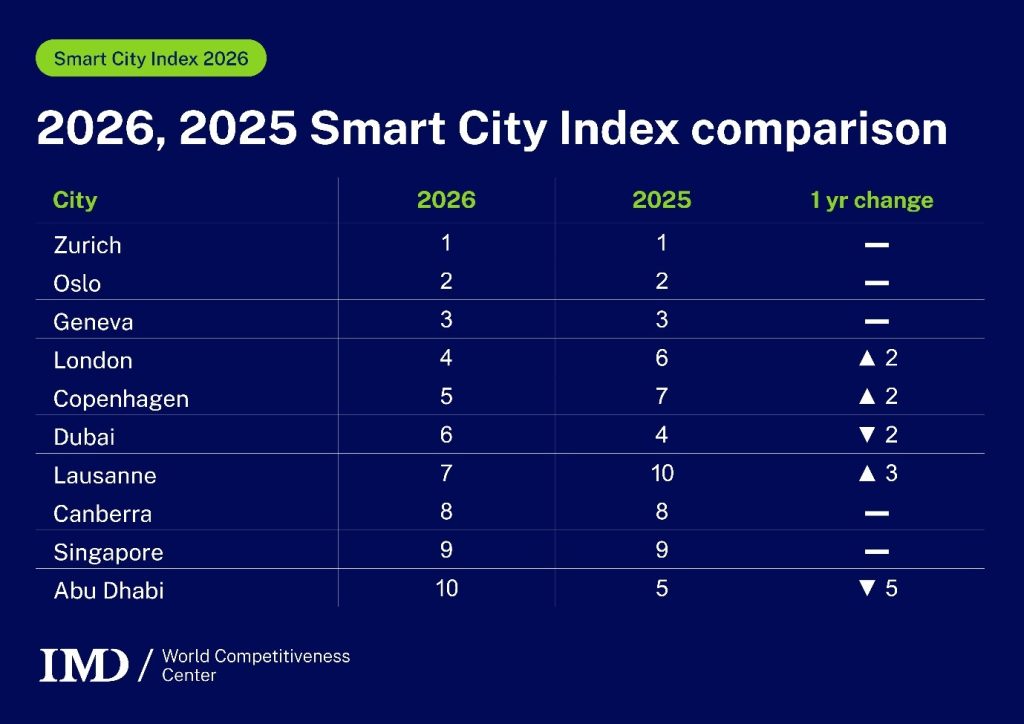 Zurich retained its position as the world’s smartest city for the seventh consecutive year, followed by Oslo and Geneva. London and Copenhagen entered the top five, ranking fourth and fifth respectively.
